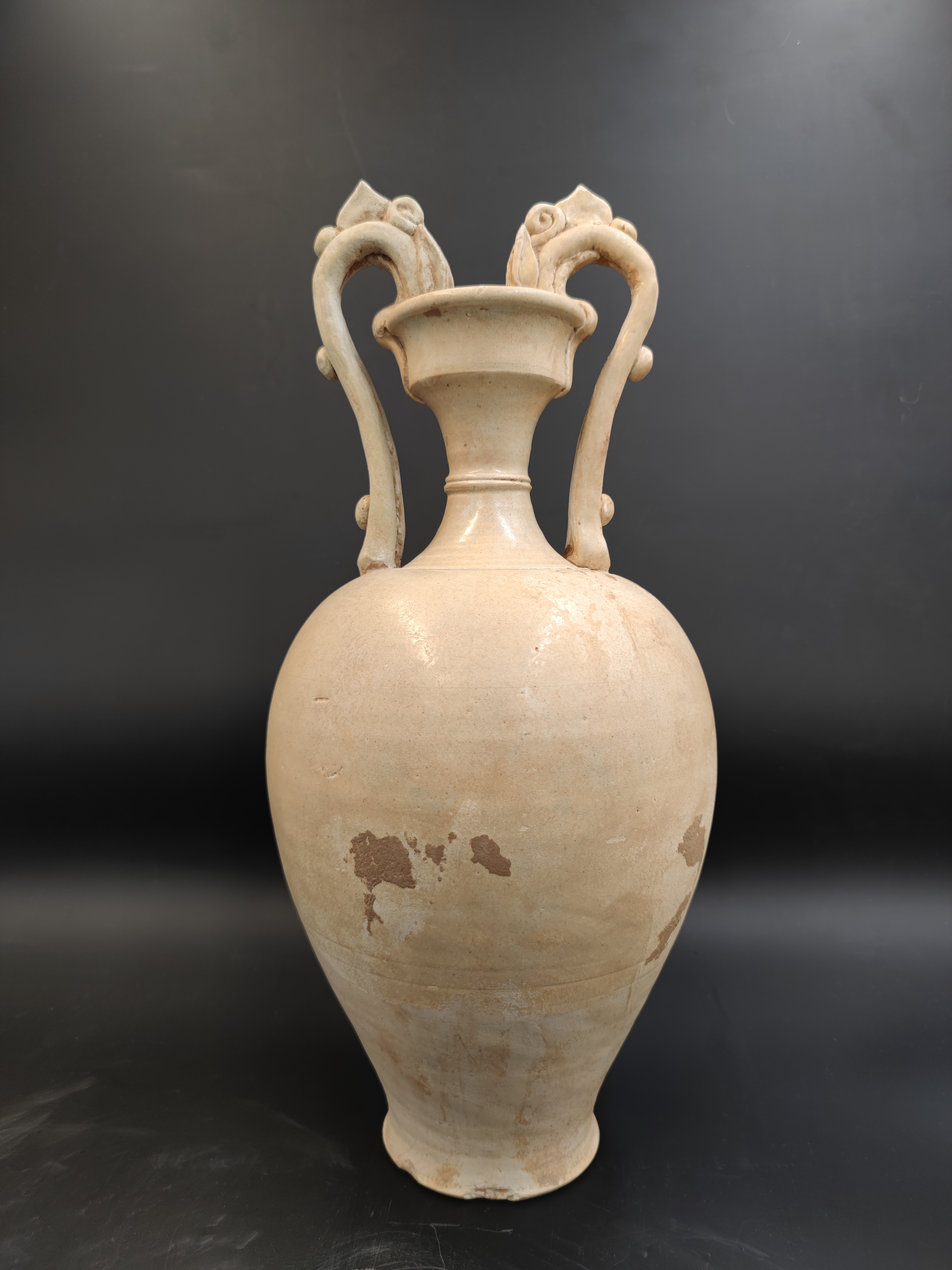 全器施青白釉,不到底。从双龙尊胎质和釉色以及烧造特征上判断,该尊是唐代巩县窑的典型器。
