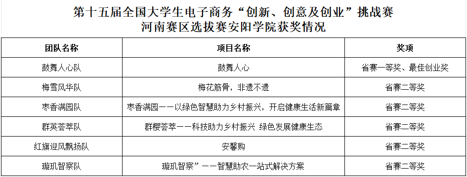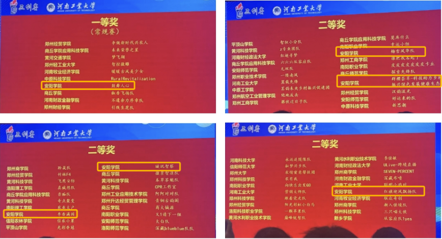 本次大赛吸引了全省数十所高校的数百支队伍参赛,竞争十分激烈。安阳学院参赛团队凭借出色的表现,共有6支队伍脱颖而出,斩获一等奖1项、二等奖5项,最佳创业奖1项。其中《鼓舞人心》项目荣获省赛一等奖并获最佳创业奖;《梅花筋骨,非遗不遗》、《枣香满园——以绿色智慧助力乡村振兴,开启健康生活新篇章》、《群樱荟萃——科技助力乡村振兴 绿色发展健康生态》、《安馨购》、《璇玑智察”——智慧助农一站式凯发娱乐官网的解决方案》5个项目荣获省赛二等奖,充分展现了学校在创新创业教育领域的丰硕成果。