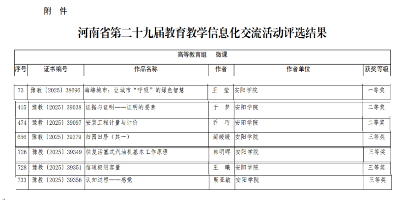 其中原阳校区建筑工程学院王莹的微课《海绵城市:让城市“呼吸”的绿色智慧》荣获一等奖;文法学院于梦的微课《证据与证明-证明的要素》、原阳校区建筑工程学院乔巧的微课《安装工程计量与计价》荣获二等奖;航空工程学院韩明晖的微课《往复活塞式汽油机基本工作原理》、计算机科学与数学学院王曦的微课《信道极限容量》、外语与教育学院靳亚敏的微课《认知过程——感觉》、职业教育学院蔺媛媛的微课《归园田居(其一)》荣获三等奖。