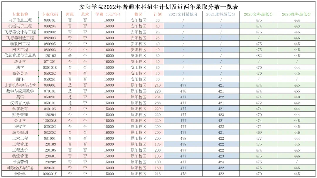 安阳学院2022年普通本科招生计划及近两年录取分数一览表