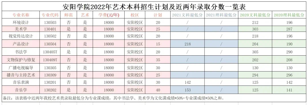 安阳学院2022年艺术本科招生计划及近两年录取分数一览表