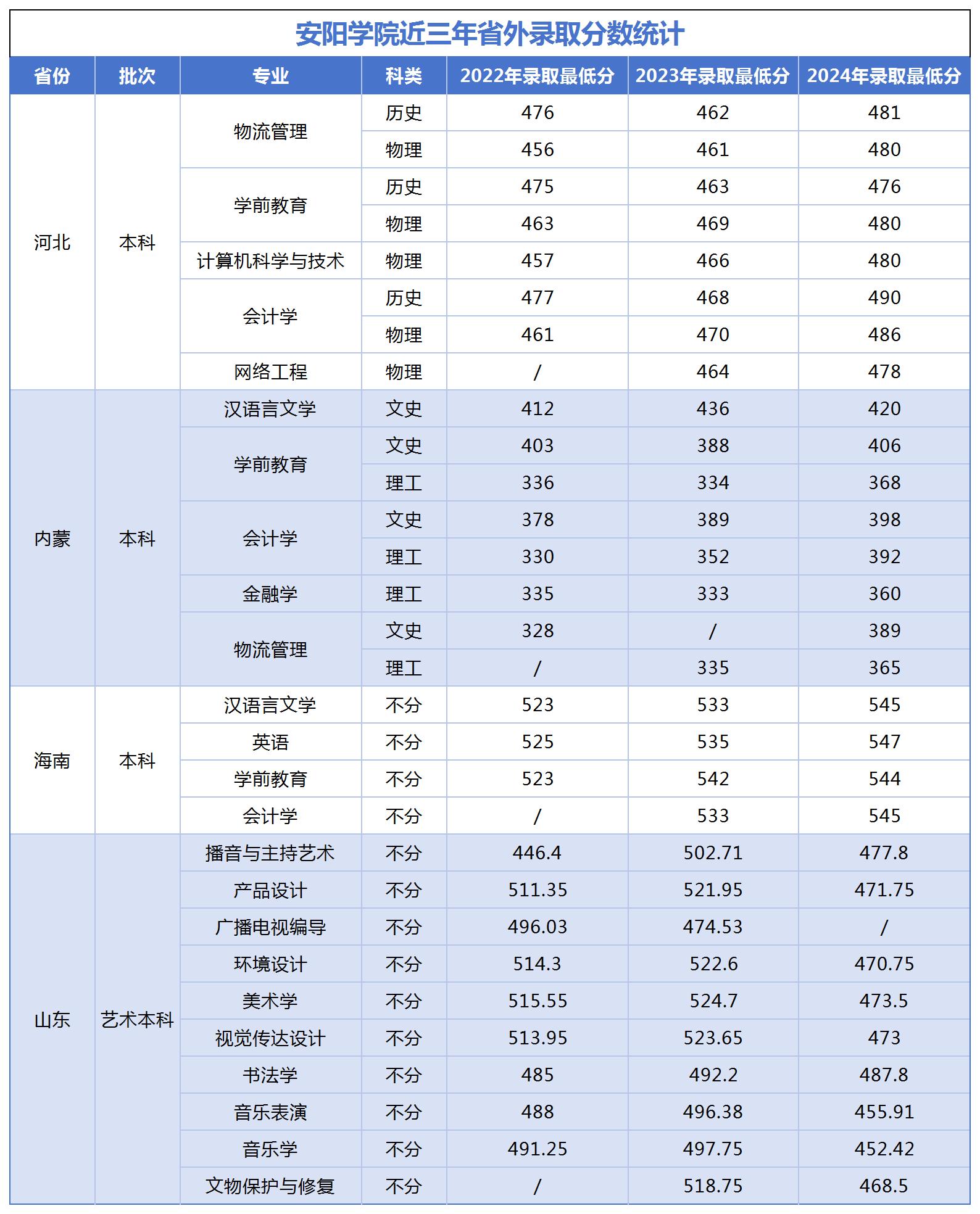 安阳学院近三年省外录取分数统计